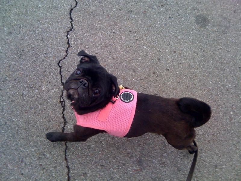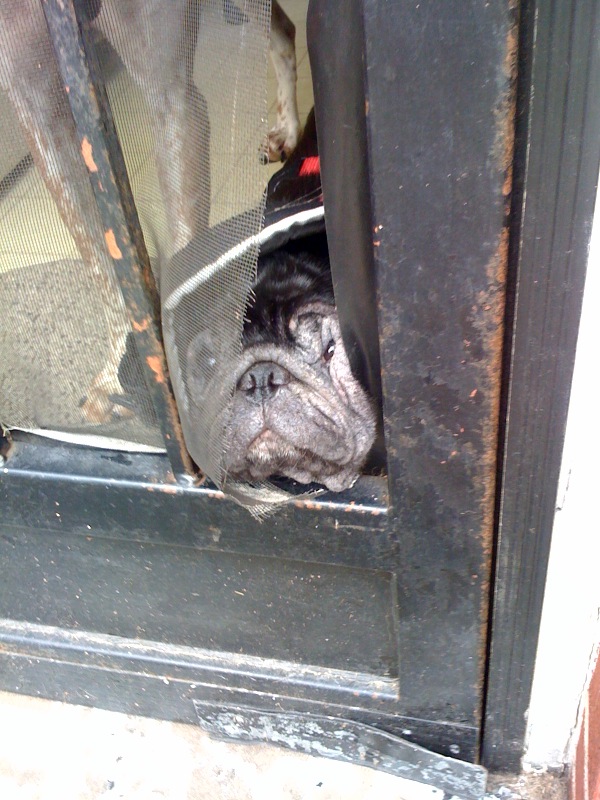 This is Annabelle the Pug on July 19, 2009. Her face is grey because she has NO FUR on it.